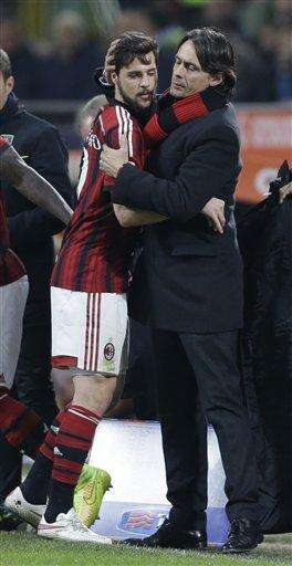 AC Milan coach Filippo Inzaghi, right, hugs Mattia Destro as he leaves the pitch during a Serie A soccer match between AC Milan and Parma, at the San Siro stadium in Milan, Italy, Sunday, Feb.1, 2015. (AP Photo/Luca Bruno) The Associated Press