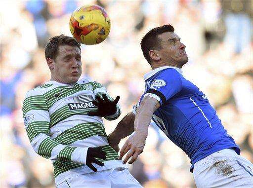 Celtic's Kris Commons, left, and Rangers' Lee McCulloch battle for the ball during the Scottish League Cup, semifinal at Hampden Park, Glasgow. Scotland, Sunday Feb. 1, 2015. (AP Photo/Owen Humphreys/PA) UNITED KINGDOM OUT The Associated Press