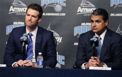 Orlando Magic general manager Rob Hennigan, left, and CEO Alex Martins listen during a news conference to announce the firing of Orlando Magic Head Coach Jacque Vaughn, Thursday, Feb. 5, 2015 in Orlando, Fla. (AP Photo/Orlando Sentinel, Stephen M. Dowell) MAGS OUT; NO SALES The Associated Press