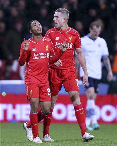 Liverpool player Raheem Sterling celebrates after scoring his side's first goal during the FA Cup Fourth Round Replay match at the Macron Stadium in Bolton, England, Wednesday Feb. 4, 2015. (AP Photo / Peter Byrne, PA) UNITED KINGDOM OUT - NO SALES - NO ARCHIVES