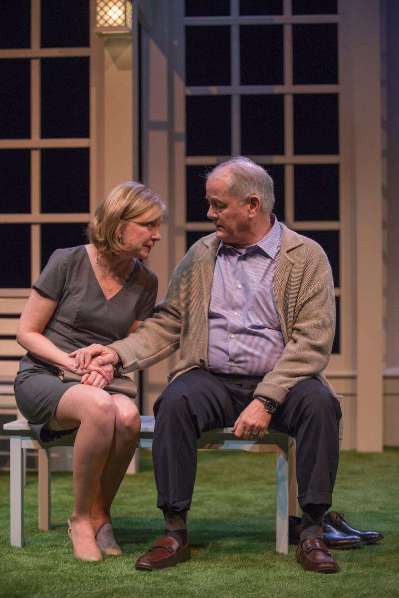Roz (Mary Beth Fisher) reassures her husband, Ray (Francis Guinan), the titular “White Guy on the Bus,” in Bruce Graham's examination of race in its world premiere at Northlight Theatre. Courtesy of Michael Brosilow