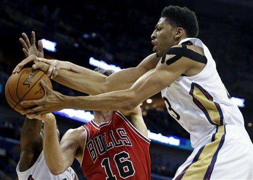 New Orleans Pelicans forward Anthony Davis, right, battles for a rebound with Chicago Bulls forward Pau Gasol (16) in the first half of an NBA basketball game in New Orleans, Saturday, Feb. 7, 2015. (AP Photo/Gerald Herbert)