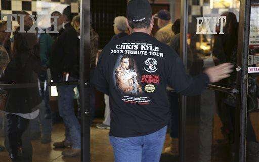 In this Thursday, Jan. 22, 2015 photo, a movie patron wears a Chris Kyle-themed shirt as heads to watch the sold out afternoon showing of the movie "American Sniper" in Stephenville, Texas. Eddie Ray Routh, an Iraq war veteran who was battling post-traumatic stress disorder and other personal issues is scheduled to stand trial in Stephenville for the slayings of two men who were trying to help him, one of them former Navy SEAL Chris Kyle, subject of the movie, and Chad Littlefield. Routh's lawyers plan an insanity defense but wonder whether he can get a fair trial in this county. (AP Photo/LM Otero)