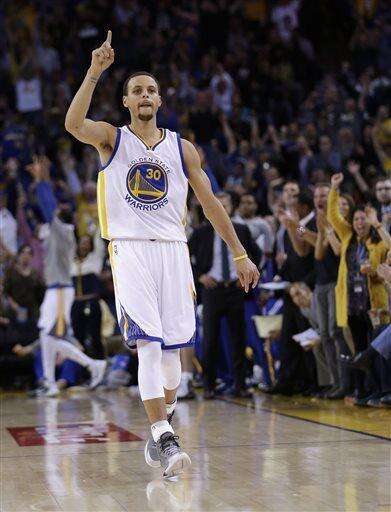 Golden State Warriors' Stephen Curry celebrates after making a 3-point basket against the Dallas Mavericks during the second half of an NBA basketball game Wednesday, Feb. 4, 2015, in Oakland, Calif. Golden State won 128-114. (AP Photo/Marcio Jose Sanchez) The Associated Press