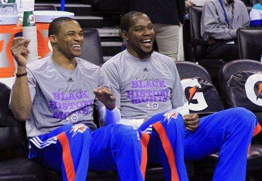 Oklahoma City Thunder guard Russell Westbrook, left, and forward Kevin Durant, right, share a laugh before the start of an NBA basketball game against the New Orleans Pelicans in Oklahoma City, Friday, Feb. 6, 2015. (AP Photo/Alonzo Adams) The Associated Press