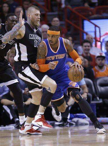 New York Knicks forward Carmelo Anthony (7) drives around Miami Heat forward Chris Andersen (11) during the first half of an NBA basketball game, Monday, Feb. 9, 2015, in Miami. (AP Photo/Wilfredo Lee), The Associated Press