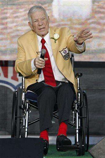 FILE- In this Aug. 6, 2011, file photo, Ed Sabol speaks during the induction ceremony at the Pro Football Hall of Fame in Canton, Ohio. Sabol, the NFL Films founder who revolutionized sports broadcasting and transformed pro football from an up-and-coming sport to must-watch theater died Monday, Feb. 9, 2015, the league said. He was 98. (AP Photo/Ron Schwane, File) The Associated Press