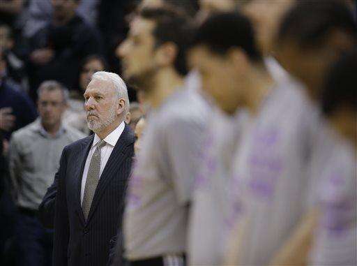 San Antonio Spurs head coach Gregg Popovich stands during the playing of the national anthem before the start of an NBA basketball game between the Indiana Pacers and the San Antonio Spurs, Monday, Feb. 9, 2015, in Indianapolis. (AP Photo/Darron Cummings)