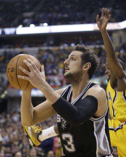 San Antonio Spurs' Marco Belinelli (3) puts up the game-winning shot during the fourth quarter of an NBA basketball game against the Indiana Pacers Monday, Feb. 9, 2015, in Indianapolis. San Antonio won the game 95-93. The win gave head coach Gregg Popovich his 1,000th career win. (AP Photo/Darron Cummings)