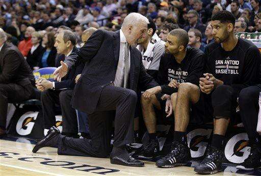 San Antonio Spurs head coach Gregg Popovich talks with Tony Parker as Tim Duncan watches the game during the second half of an NBA basketball game against the Indiana Pacers Monday, Feb. 9, 2015, in Indianapolis. San Antonio won the game 95-93. Popovich reached the 1,000-win milestone Monday night. (AP Photo/Darron Cummings)