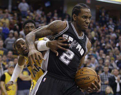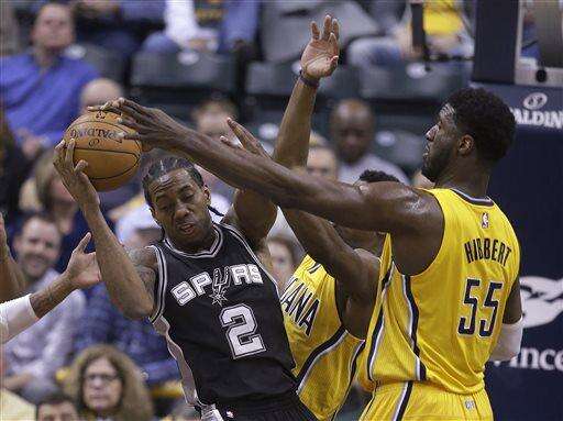 San Antonio Spurs' Kawhi Leonard (2) grabs a rebound against Indiana Pacers' Roy Hibbert (55) during the first half of an NBA basketball game Monday, Feb. 9, 2015, in Indianapolis. (AP Photo/Darron Cummings)