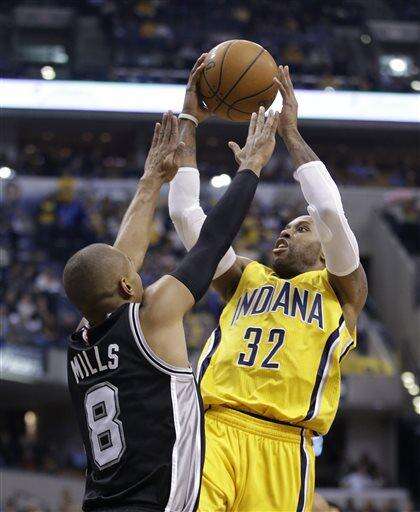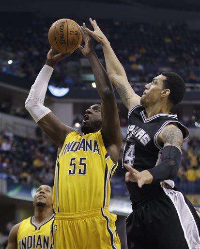 San Antonio Spurs' Danny Green (14) is fouled buy Indiana Pacers' Solomon Hill (44) during the first half of an NBA basketball game Monday, Feb. 9, 2015, in Indianapolis. (AP Photo/Darron Cummings)