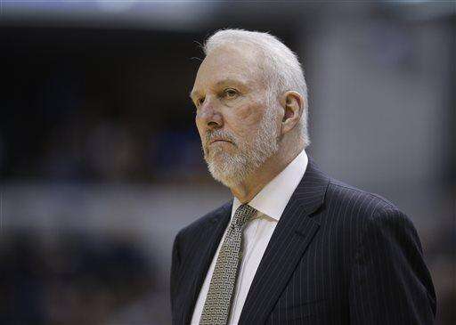 San Antonio Spurs head coach Gregg Popovich watches during the first half of an NBA basketball game against the Indiana Pacers Monday, Feb. 9, 2015, in Indianapolis. (AP Photo/Darron Cummings)