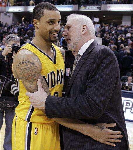 Indiana Pacers' George Hill (3) congratulates San Antonio Spurs head coach Gregg Popovich following an NBA basketball game Monday, Feb. 9, 2015, in Indianapolis. San Antonio won the game 95-93. With the win Popvicch joined the 1000-win club.(AP Photo/Darron Cummings)