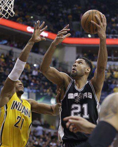 San Antonio Spurs' Tim Duncan (21) shoots against Indiana Pacers' David West (21) during the second half of an NBA basketball game Monday, Feb. 9, 2015, in Indianapolis. San Antonio won the game 95-93. The win gave head coach Gregg Popovich his 1,000th career win. (AP Photo/Darron Cummings)