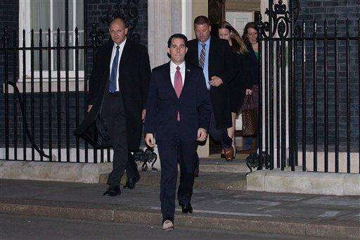 Wisconsin Gov. Scott Walker leaves 10 Downing street after a private meeting with British Prime Minister David Cameron in London, England, Tuesday, Feb. 10, 2015. Walker is leading a coalition of Wisconsin government and business officials on a trade mission that runs until Friday. The trip gives him a chance to bolster his overseas and foreign policy credentials as he considers running for president in 2016. (AP Photo/Tim Ireland) The Associated Press