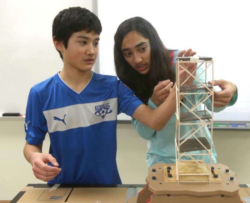 Crone Middle School seventh-graders Max Pemberton and Maya Knotts prepare Wednesday to test the strength of their wooden structures during their earth science class, when teacher Anna Zuccarini shook the structures using a vibrating earthquake simulator. Daniel White/dwhite@dailyherald.com