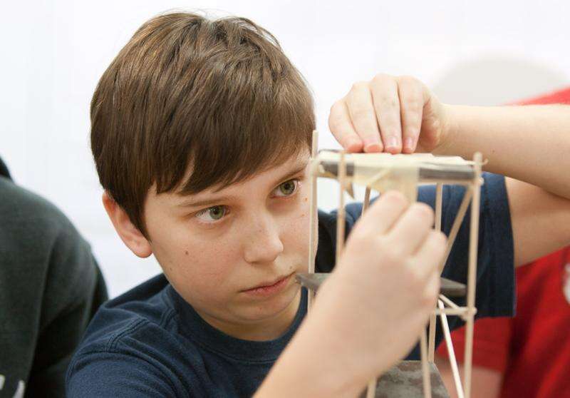 Mark Lelek, a student in Anna Zuccarini's seventh-grade gifted earth science class at Crone Middle School in Naperville, prepares to test the strength of his team's wooden structure Wednesday during an earthquake simulation. Daniel White/dwhite@dailyherald.com