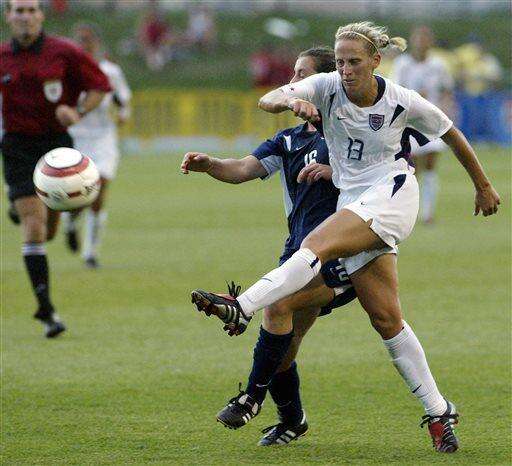 FILE - In this July 21, 2004, file photo, USA Women's National Team forward Kristine Lilly (13) shoots as Australian Women's National Team forward Selin Kuralay (16) defends during the second half of their exhibition game in Blaine, Minnesota. A day after her former team faces England in an exhibition, Lilly will be inducted into the National Soccer Hall of Fame. (AP Photo/Paul Battaglia, File) The Associated Press