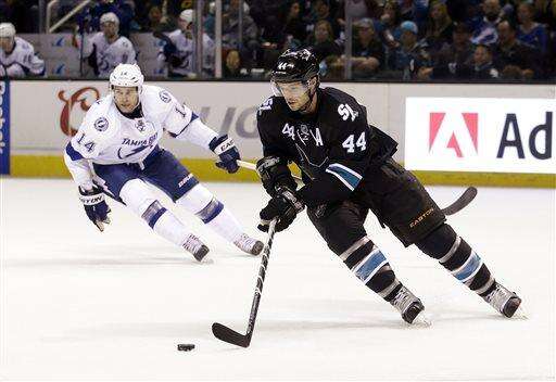 San Jose Sharks' Marc-Edouard Vlasic (44) controls the puck behind Tampa Bay Lightning's Brett Connolly (14) during the second period of an NHL hockey game Sunday, Feb. 15, 2015, in San Jose, Calif. (AP Photo/Marcio Jose Sanchez) The Associated Press