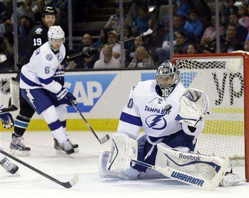 Tampa Bay Lightning goalie Ben Bishop stops a shot by the San Jose Sharks during the first period of an NHL hockey game Sunday, Feb. 15, 2015, in San Jose, Calif. (AP Photo/Marcio Jose Sanchez) The Associated Press