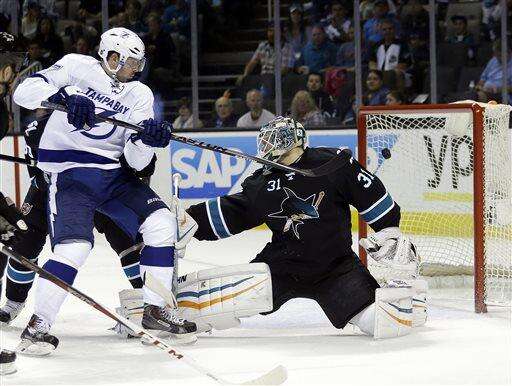 San Jose Sharks goalie Antti Niemi, right, is beaten for a goal on a shot by Tampa Bay Lightning's Ryan Callahan, not seen, next to Lightning center Alex Killorn, left, during the second period of an NHL hockey game Sunday, Feb. 15, 2015, in San Jose, Calif. (AP Photo/Marcio Jose Sanchez) The Associated Press