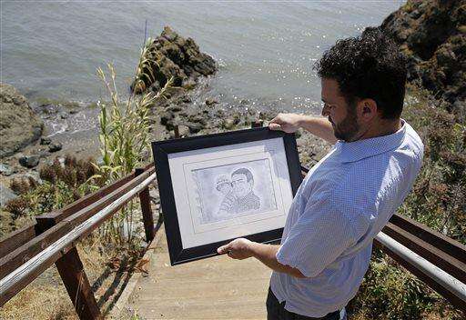In this Tuesday, July 8, 2014 photo, Dan Ager looks at a graphite sketch showing his father, Alan Ager, and him, while walking toward a beach outside San Quentin State Prison in San Quentin, Calif. Alan Ager was killed in 2010 at Salinas Valley State Prison and also served time in San Quentin. California state prison inmates are killed at a rate that is double the national average, and sex offenders like Alan Ager account for a disproportionate number of victims, according to an Associated Press analysis of corrections records. (AP Photo/Eric Risberg) The Associated Press