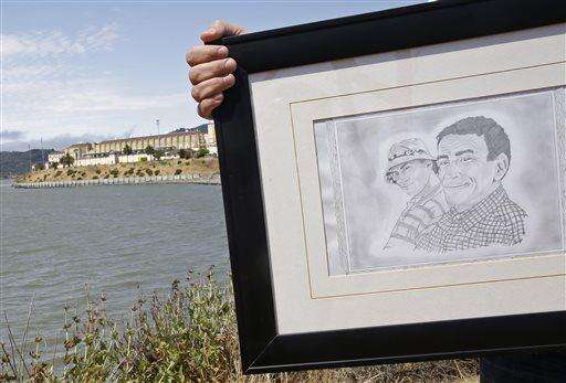 In this Tuesday, July 8, 2014 photo, Dan Ager holds a graphite sketch showing his father, Alan Ager, and him, while standing outside San Quentin State Prison in San Quentin, Calif. Alan Ager was killed in 2010 at Salinas Valley State Prison and also served time in San Quentin. California state prison inmates are killed at a rate that is double the national average, and sex offenders like Alan Ager account for a disproportionate number of victims, according to an Associated Press analysis of corrections records. (AP Photo/Eric Risberg) The Associated Press