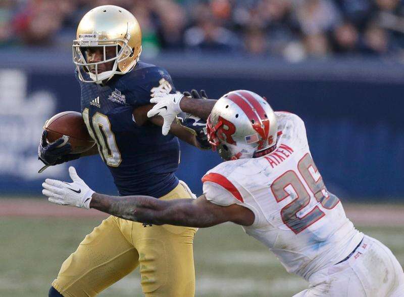 FILE - In this Dec. 28, 2013, file photo, Notre Dame's DaVaris Daniels (10) stiff-arms Rutgers's Johnathan Aiken (26) during the second half of the Pinstripe Bowl NCAA college football game at Yankee Stadium in New York. Notre Dame barred football players KeiVarae Russell, DaVaris Daniels, Ishaq Williams, and Kendall Moore from practice and games on Friday, Aug. 15, 2014, after announcing an investigation into "suspected academic dishonesty" after allegations surfaced that someone had done course work for them. (AP Photo/Frank Franklin II, File)