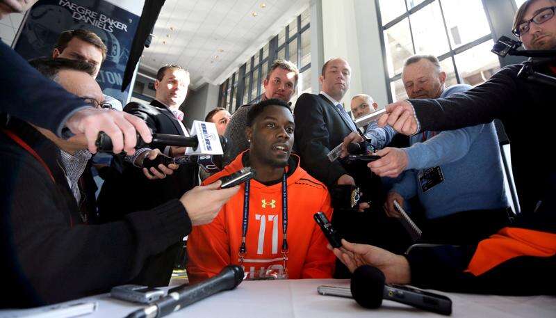 Notre Dame wide receiver DaVaris Daniels answers a question during a news conference Thursday at the NFL Scouting Combine in Indianapolis. Associated Press