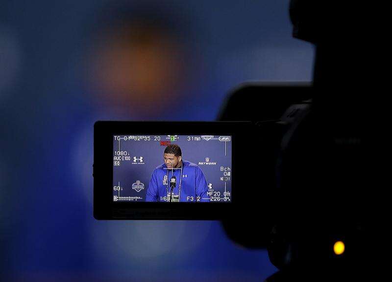 LSU offensive lineman La'El Collins is shown in a camera monitor as he answers a question Wednesday during a news conference at the NFL football scouting combine in Indianapolis. Associated Press