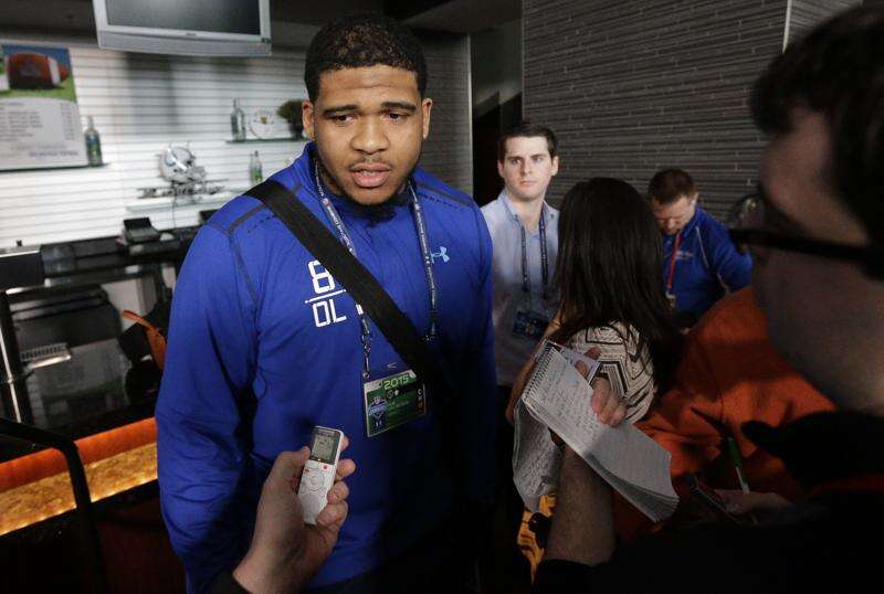 LSU offensive lineman La'El Collins answers a question Wednesday during a news conference at the NFL football scouting combine in Indianapolis. Associated Press