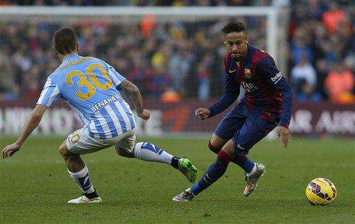 Barcelona's Neymar, right, fights for the ball against Malaga's Sergi Darder, left, during a Spanish La Liga soccer match at the Camp Nou stadium in Barcelona, Spain, Saturday, Feb. 21, 2015. (AP Photo/Emilio Morenatti) The Associated Press