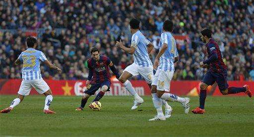 Barcelona's Lionel Messi, from Argentina, 2nd left, fights for the ball against Malaga's Miguel Torres, left, during a Spanish La Liga soccer match at the Camp Nou stadium in Barcelona, Spain, Saturday, Feb. 21, 2015. (AP Photo/Emilio Morenatti) The Associated Press