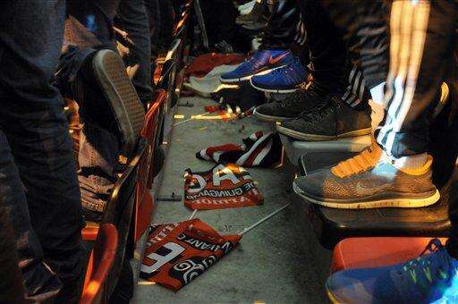 In this photo dated Thursday, Feb. 19, 2015, Guingamp flags litter the floor between seats that fans at the Roudourou stadium in Guingamp, western France, are standing on to watch the club beat Dynamo Kiev 2-1 in the Europa League. With one of the puniest budgets in France's top division, Guingamp can't splash the cash like some of the mammoths - Qatar-owned Paris Saint-Germain being the prime example - it competes against and humbles from time to time. (AP Photo/John Leicester) The Associated Press
