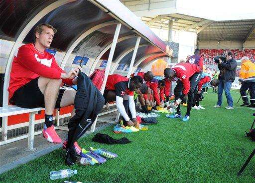 In this photo dated Wednesday, Feb. 18, 2015, Guingamp’s Danish goalkeeper Jonas Lossl puts on his boots and kit for training at the club’s Roudourou stadium in Guingamp, western France. With one of the puniest budgets in France's top division, Guingamp can't splash the cash like some of the mammoths - Qatar-owned Paris Saint-Germain being the prime example - it competes against and humbles from time to time. (AP Photo/John Leicester) The Associated Press