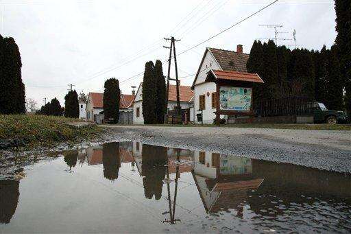 Houses are reflected in a puddle on the main road in the village of Megyer, Veszprem county, 190 kilometers (120 miles) southwest of Budapest, Hungary, Wednesday, Feb. 25, 2015. The village of Megyer, population 18, has put itself up for rent to companies and tourists. For 210,000 forints ($750; 690 euro) a day, a prospective renter gets seven guesthouses that sleep 39 people, four streets, a bus stop, a barn, a chicken yard, six horses, two cows, three sheep and four hectares (10 acres) of farmland - along with the possibility of temporarily being named deputy mayor. (AP Photo/MTI, Lajos Nagy)