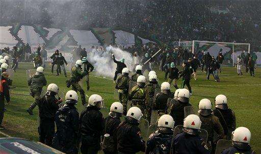 In this photo taken on Sunday, Feb. 22, 2015, Panathinaikos fans clash with riot police before a Greek Super League soccer match against Olympiakos at the Apostolos Nikolaides stadium in Athens. Greece's top soccer league on Wednesday, Feb 25, 2015 has been suspended indefinitely because of continued match violence. The action followed weekend violence at a league match between rivals Olympiakos and Panathinaikos, and a brawl between club officials Tuesday at a board meeting of league organizers. (AP Photo/InTime Sports) GREECE OUT