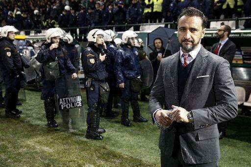 Olympiakosâ coach Vitor Perreira from Portugal looks on before a Greek Super League soccer match against Panathinaikos at the Apostolos Nikolaides stadium in Athens, Sunday, Feb. 22, 2015. (AP Photo/Yorgos Karahalis)