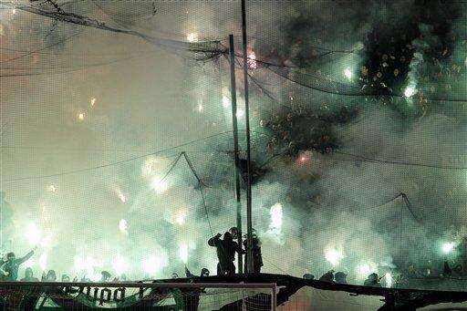 In this photo taken on Sunday, Feb. 22, 2015, Panathinaikos fans throw items at riot police before a Greek Super League soccer match against Olympiakos at the Apostolos Nikolaides stadium in Athens. Greece's top soccer league on Wednesday, Feb 25, 2015 has been suspended indefinitely because of continued match violence. The action followed weekend violence at a league match between rivals Olympiakos and Panathinaikos, and a brawl between club officials Tuesday at a board meeting of league organizers. (AP Photo/InTime Sports) GREECE OUT