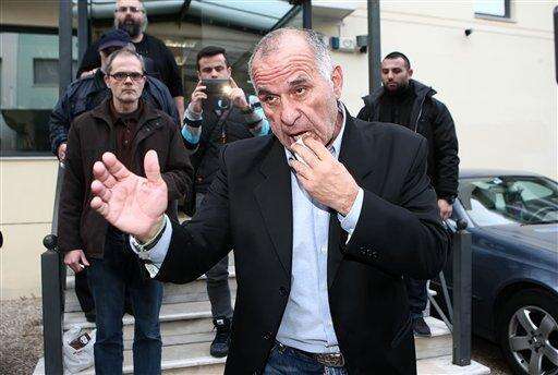 In this photo taken on Tuesday, Feb. 24, 2015, Panathinaikos official Vassilis Constantinou, a former national team goalkeeper walked out of Organizers of Greece's top-flight league executive meeting holding his lower lip, in Athens. Konstantinou told reporters he had been punched by an Olympiakos security guard. Greece's top soccer league on Wednesday, Feb 25, 2015 has been suspended indefinitely because of continued match violence. The action followed weekend violence at a league match between rivals Olympiakos and Panathinaikos, and a brawl between club officials Tuesday at a board meeting of league organizers. (AP Photo/InTime Sports, Stelios Volitakis) GREECE OUT