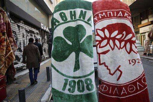 Men walk past blankets for sale of the two top soccer clubs of Greece Olympiakos, right, and Panathinaikos in central Athens, on Wednesday, Feb. 25, 2015. Greece's highest sports official says the country's top soccer league will be suspended next season unless all 18 clubs introduce smart-card ticketing and security camera systems at matches.The warning followed weekend violence at a league match between rivals Olympiakos and Panathinaikos, and a brawl between club officials Tuesday at a board meeting of league organizers. (AP Photo/Petros Giannakouris)