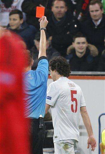 Atletico's Tiago was dismissed in the 77th with a second yellow card for sliding in on Bellarabi. He earned his first in the first half for breaking up a counterattack with a cynical foul on Josip Drmic.
