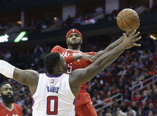 Houston Rockets' Josh Smith (5) passes the ball around Los Angeles Clippers' Glen Davis (0) in the second half of an NBA basketball game Wednesday, Feb. 25, 2015, in Houston. The Rockets won 110-105. (AP Photo/Pat Sullivan) The Associated Press