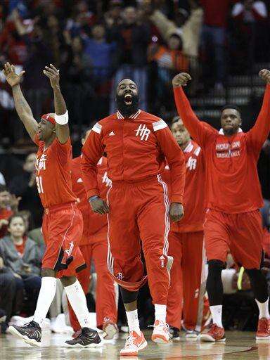 Houston Rockets Jason Terry, left, James Harden, center, and Terrence Jones celebrate as the Rockets take the lead against the Los Angeles Clippers in the fourth quarter of an NBA basketball game Wednesday, Feb. 25, 2015, in Houston. The Rockets won 110-105. (AP Photo/Pat Sullivan) The Associated Press
