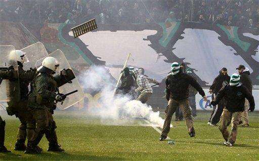 In this photo taken on Sunday, Feb. 22, 2015, Panathinaikos fans clash with riot police before a Greek Super League soccer match against Olympiakos at the Apostolos Nikolaides stadium in Athens. Greece's top soccer league on Wednesday, Feb 25, 2015 has been suspended indefinitely because of continued match violence. The action followed weekend violence at a league match between rivals Olympiakos and Panathinaikos, and a brawl between club officials Tuesday at a board meeting of league organizers. (AP Photo/InTime Sports) GREECE OUT