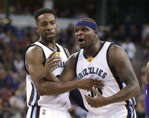 Memphis Grizzlies' Jeff Green, left, restrains teammate Zach Randolph after he was called for a technical foul after getting into a brief altercation with Sacramento Kings center DeMarcus Cousins during the third quarter of an NBA basketball game in Sacramento, Calif., Wednesday, Feb. 25, 2015. The Kings won 102-90. (AP Photo/Rich Pedroncelli) The Associated Press