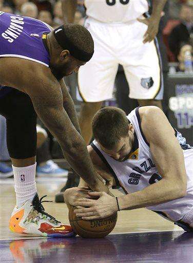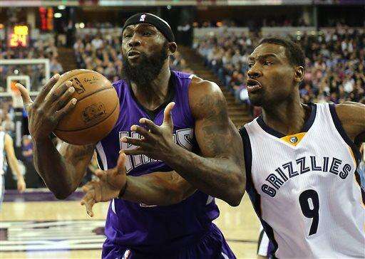 Sacramento Kings forward Reggie Evans, left, and Memphis Grizzlies guard Tony Allen battle for the ball during the first quarter of an NBA basketball game Wednesday, Feb. 25, 2015, in Sacramento, Calif. (AP Photo/Rich Pedroncelli) The Associated Press
