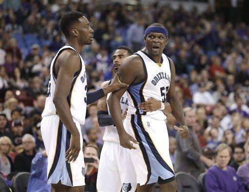 Memphis Grizzlies' Jeff Green, left, and Mike Conley, center, restrain teammate Zach Randolph after he and Sacramento Kings center DeMarcus Cousins got in each others face during the third quarter of an NBA basketball game in Sacramento, Calif., Wednesday, Feb. 25, 2015. Randolph was called for a technical foul on the play. The Kings won 102-90. (AP Photo/Rich Pedroncelli) The Associated Press