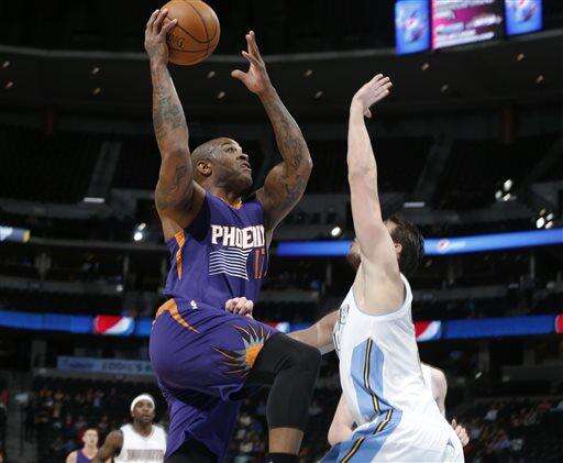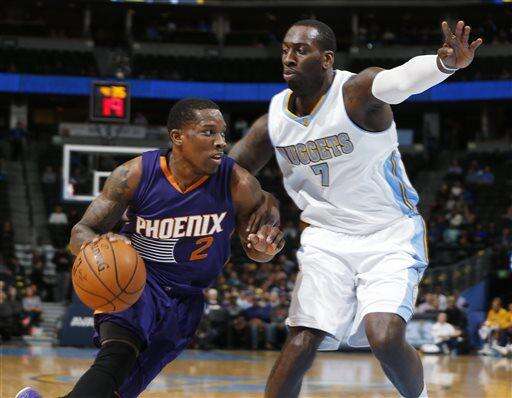 Phoenix Suns guard Eric Bledsoe, left, drives against Denver Nuggets forward J.J. Hickson during the first quarter of an NBA basketball game Wednesday, Feb. 25, 2015, in Denver. (AP Photo/David Zalubowski) The Associated Press